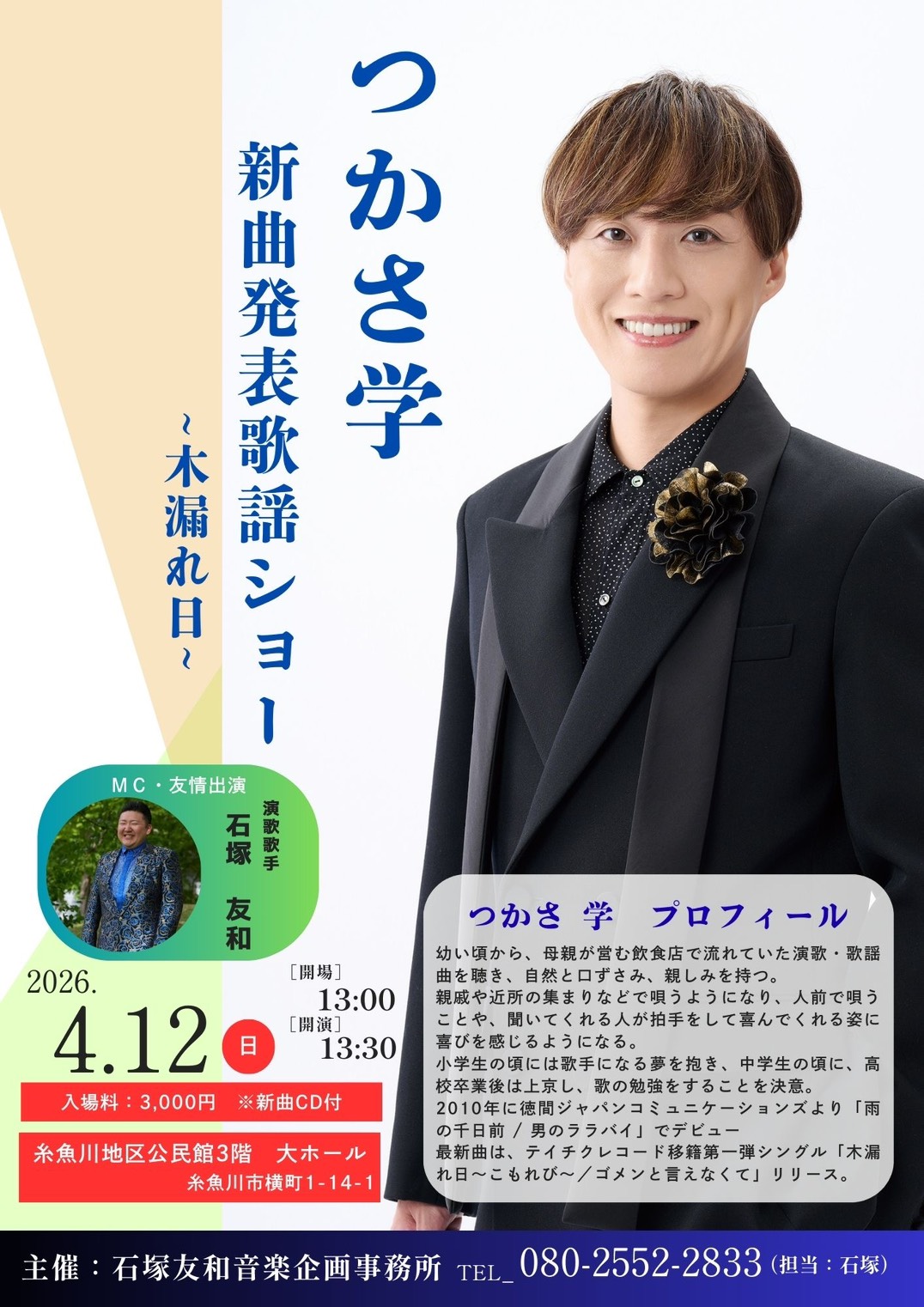 2026-02-19|EVENT 4/12新潟県糸魚川市「つかさ学新曲発表歌謡ショー」出演 4月12日(日)新潟県糸魚川市糸魚川地区公民館3階大ホールにて開催されます「つかさ学新曲発表歌謡ショー」に出演致します。 会場:糸魚川地区公民館3階大ホール 糸魚川氏横町1-14-1 時間:開場13:00開演13:30 入場料:3000円 ※新曲CD付 主催:石塚友和音楽企画事務所 TEL:080-2552-2833 (担当:石塚) チケット発売中 ご希望の方は、 お取次ぎしますので つかさ学後援会事務局 070-8521-5741 までご連絡ください。