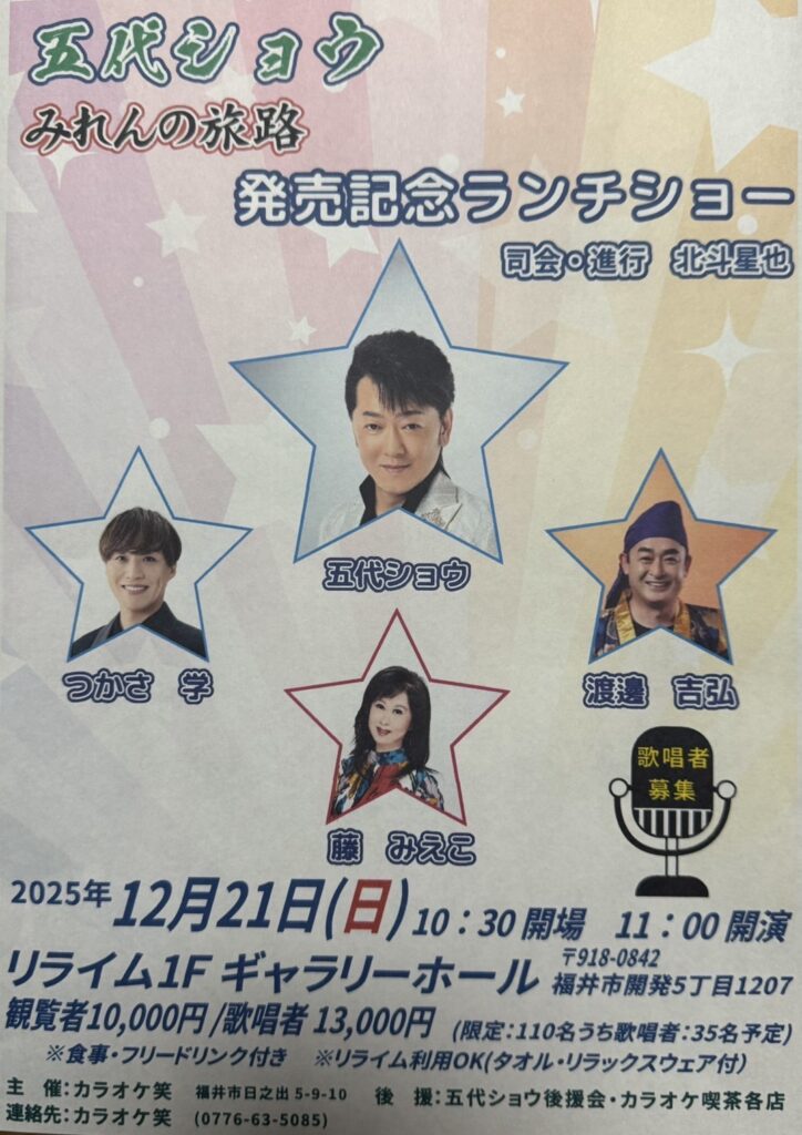 料金:3,500円(出演歌手のCDシングル各1枚/歌手指定はできません、お飲み物1ドリンク券が含まれます)